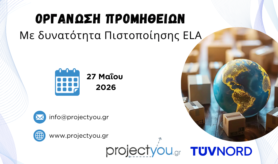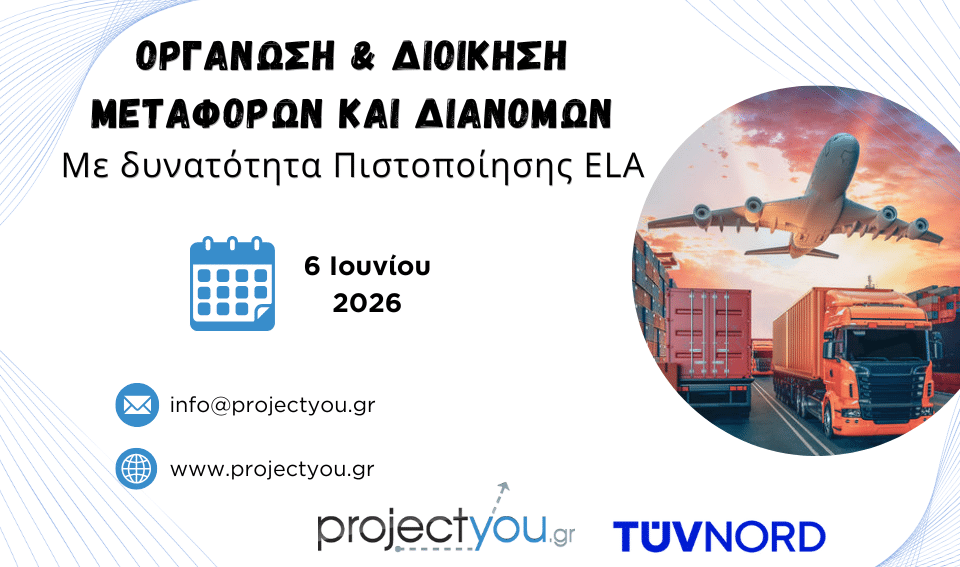 Η projectyou, εγκεκριμένος Φορέας Εκπαίδευσης από το ΙLME για την Ελλάδα και την Κύπρο, για τη Διεθνή Πιστοποίηση στην Εφοδιαστική Αλυσίδα (Logistics) από το European Logistics Association (ELA), ανακοινώνει τον 22ο κύκλο Εκπαίδευσης και Προετοιμασίας για την Πιστοποίηση ELA. Ο 22ος κύκλος αρχίζει στις 25.04.26 και ολοκληρώνεται στις 24.06.26.